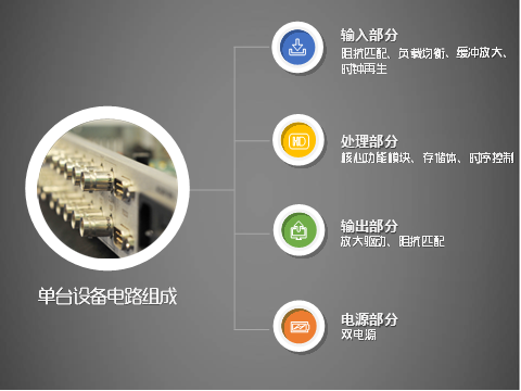 播出線上的切換器、幀同步機(jī)、鍵混器、響度控制器都是獨(dú)立的設(shè)備,我們稱(chēng)之為“分體式”設(shè)備。每臺(tái)設(shè)備功能單一,自成一體。不管是哪種設(shè)備,都包含以下主要部分:輸入電路(阻抗匹配、緩沖放大、電纜均衡、時(shí)鐘再生)、控制電路、輸出電路(驅(qū)動(dòng)放大、阻抗匹配)、電源、接插件、機(jī)箱,另外就是功能模塊。