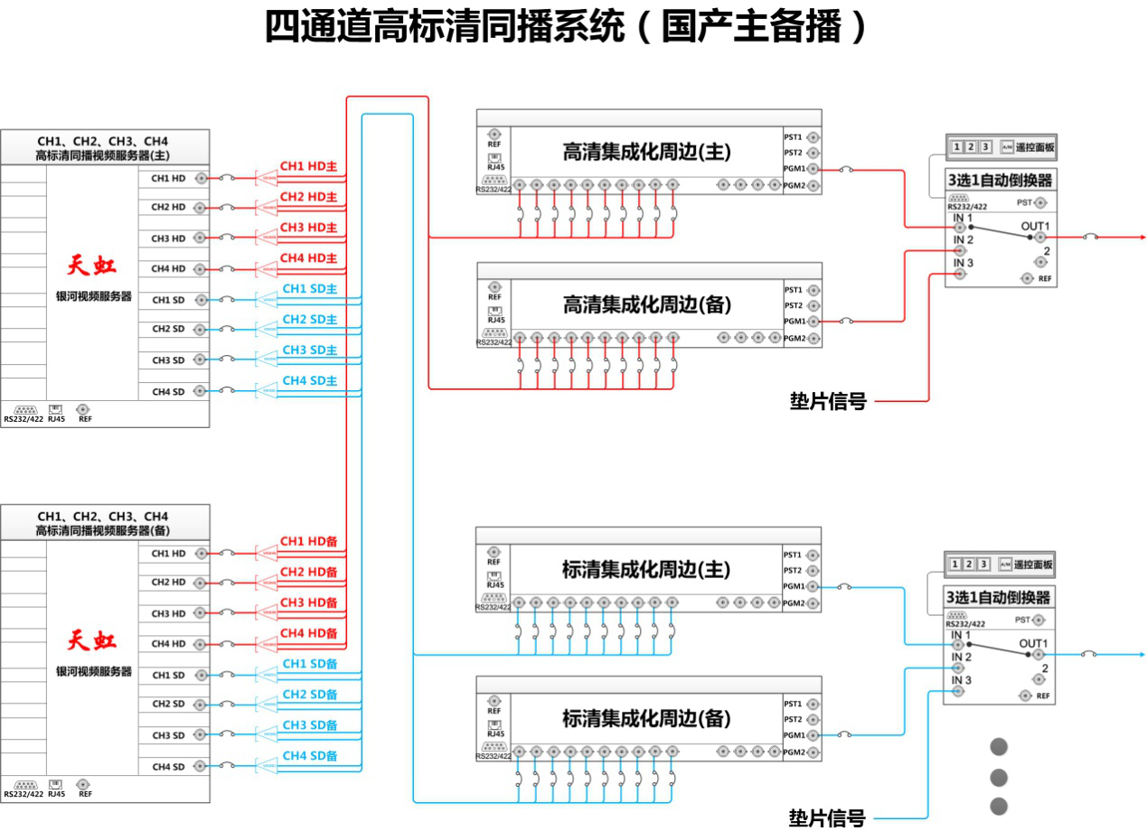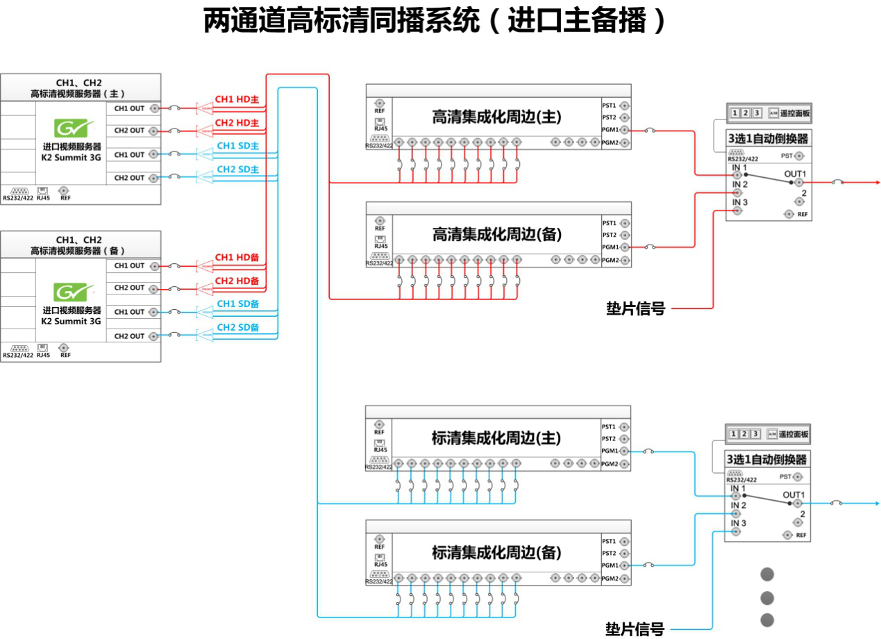 備服務器與主服務器的配置完全相同,輸出的信號也完全相同,實現(xiàn)完全鏡像備份。不同的是,主服務器的信號送集成化周邊設備(高清和標清)的主路輸入,備服務器的信號送集成化周邊設備(高清和標清)的備路輸入。備服務器的信號全部作為備信號。