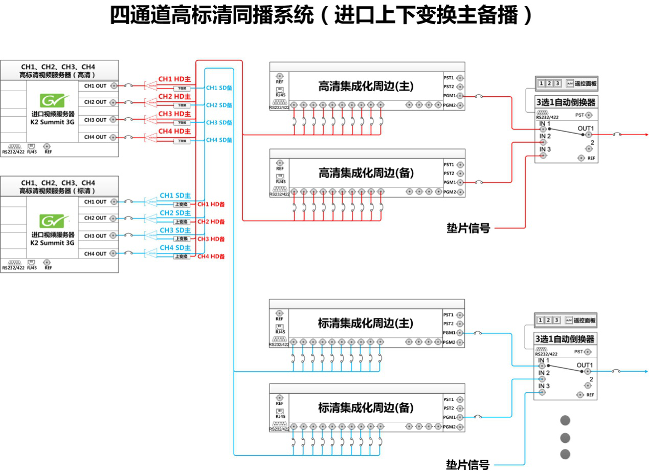 把主服務器輸出的高清信號下變換為標清信號,作為備路標清信號,送標清集成化周邊的備路輸入;把備服務器輸出的標清信號上變換為高清信號,作為備路的高清信號,送高清集成化周邊的備路輸入。